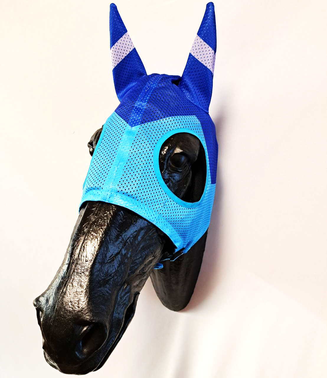 船橋競馬場所属HM厩舎様のオリジナルメンコを制作いたしました。青と水色の山型のデザインで耳の部分には薄紫のラインを入れております。
