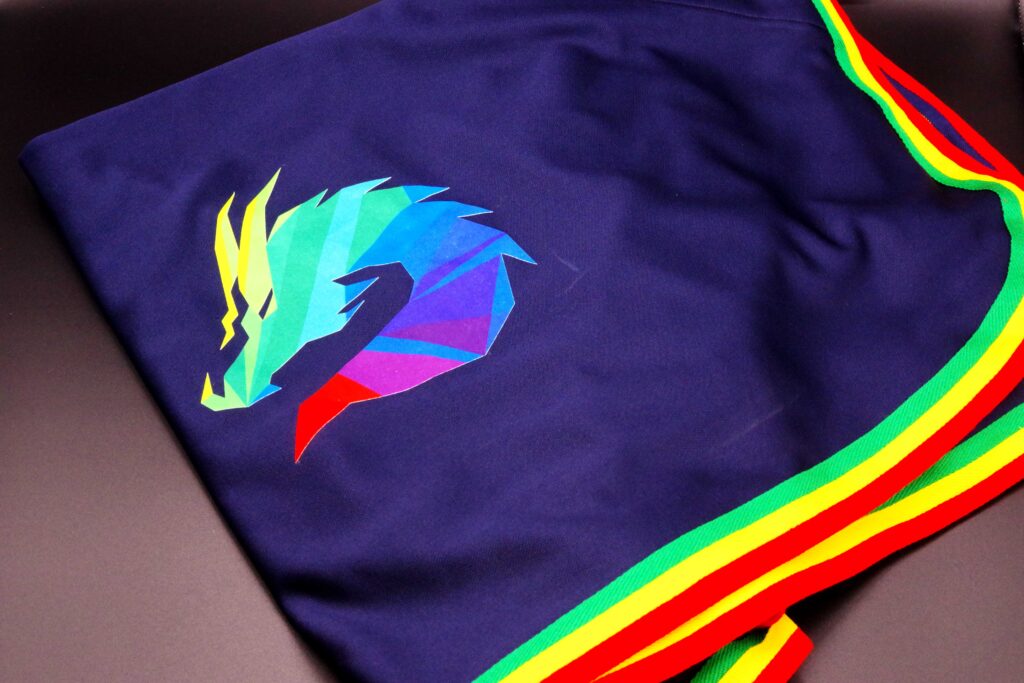 船橋競馬場所属HT厩舎様のロゴを使用しオリジナルワッペンを作成後、熱圧着にて馬服に取付をいたしました。昇華転写シートを使用することで色鮮やかなフルカラーで表現可能です。素材はサテンタイプとフロッキータイプがあり、今回はフロッキータイプを使用することで起毛の独特の風合いのオリジナルワッペンとなっております。